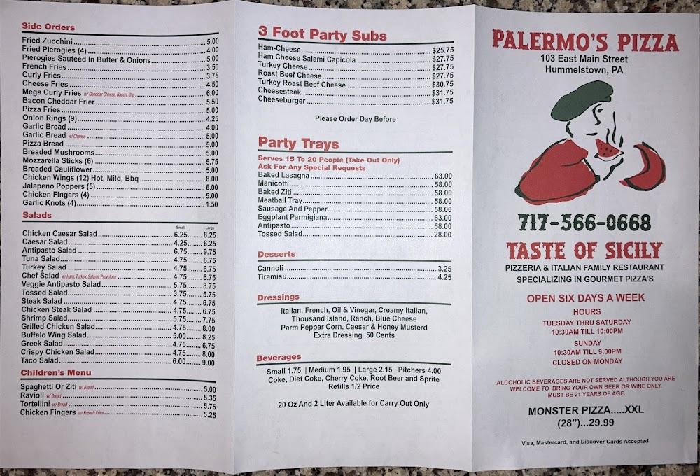 Welcome to Palermo's Pizzeria, your go-to spot for delicious, traditional Italian cuisine in Hummelstown, PA. Conveniently located at 103 E Main St, we offer a cozy atmosphere perfect for lunch, dinner, or a solo bite. Enjoy our expansive menu featuring mouthwatering pizzas, hearty subs, and tempting desserts. Whether you dine in, take out, or opt for delivery, we have you covered with accessible seating and a welcoming vibe. Join us on our patio or call ahead for reservations to savor a meal that feels like home. With free street parking and a kid-friendly menu, everyone is welcome at Palermo's!
